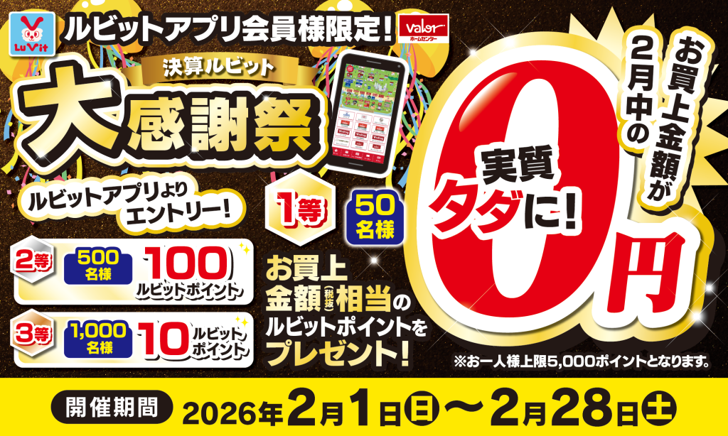 ◆ ルビットアプリ会員様限定 ◆ 2026年2月1日(日)~2月28日(土)の期間中にホームセンターバロー・プロサイト・キャンプリンクで お買物していただいたお客様の中から 抽... -