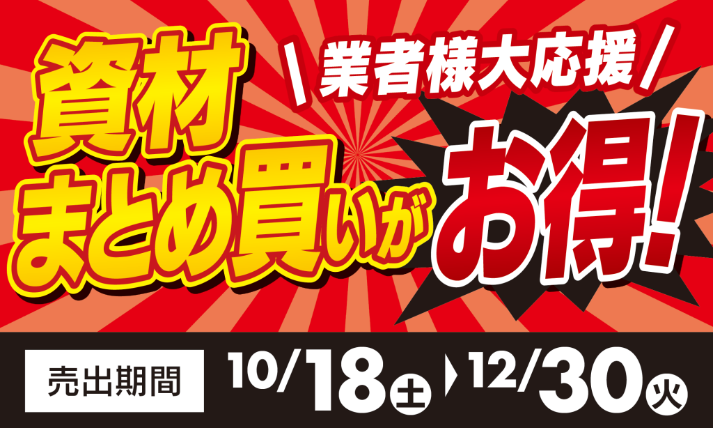 10月18日号 業者様大応援! 資材まとめ買いがお得!10月18日(土)〜12月30日(火)までセール実施中!その他のチラシは↓をチェック! スマートオーダーのご案内 詳しくは下記をタップ! 「スマートオーダー」は、スマホから注...