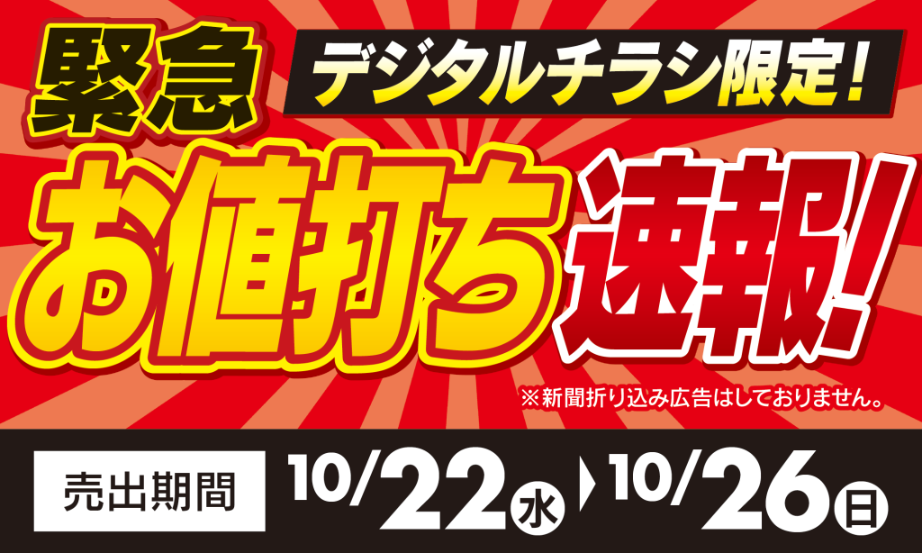 10月22日号 緊急お値打ち速報!10月22日(水)~26日(日)のセール実施中!お近くの店舗のチラシをチェック! スマートオーダーご利用キャンペーン開催中 詳しくは下記をタップ! 「スマートオーダー」は...