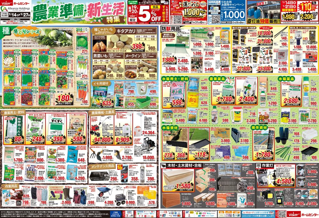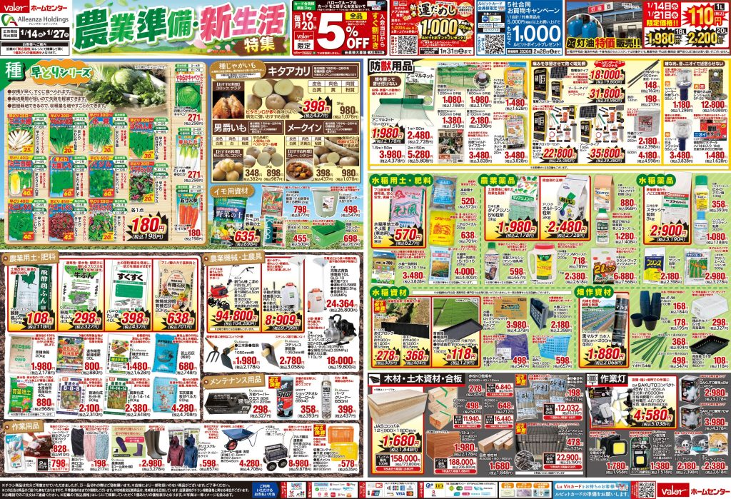 1月14日号 農業準備・新生活 特集 2026 1/13 全店(萩原店・大和店・岩村店・稲沢平和店・豊橋神野店を除く)豊橋神野店 限定 【取り扱い店舗】 松阪店・各務原中央店・ミタス伊勢店・瑞浪中央店・関緑ヶ丘店・高山店・美濃加茂店・正木店・可児坂戸店・北方店・羽島インター店・久居インター店・小牧岩崎店・中津川坂本店・千音寺店・江南店・桃花台店・鈴鹿店・瀬戸店・領下店・勝幡店・養老店・多治見南店・守山店・国府店・本巣文殊店・池田店・中津川苗木店・高蔵寺店・藤岡店・大垣南店・大口店・高富店 2026年1月14日(水)〜1月27日(火)までセール実施中!お近くの店舗のチラシをチェック!