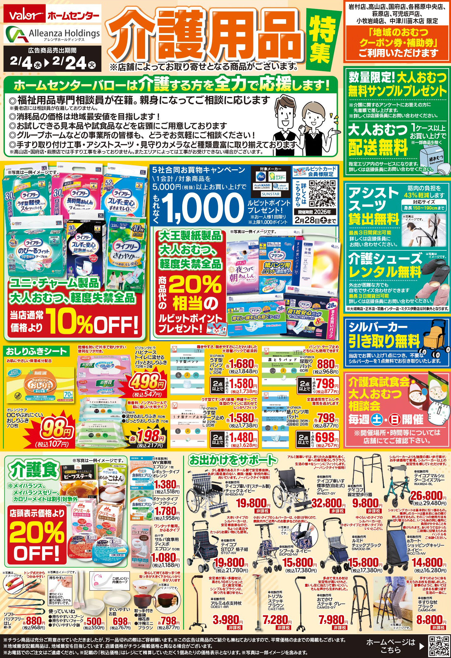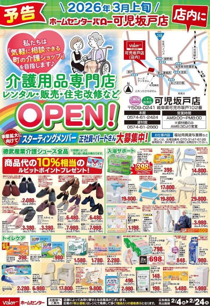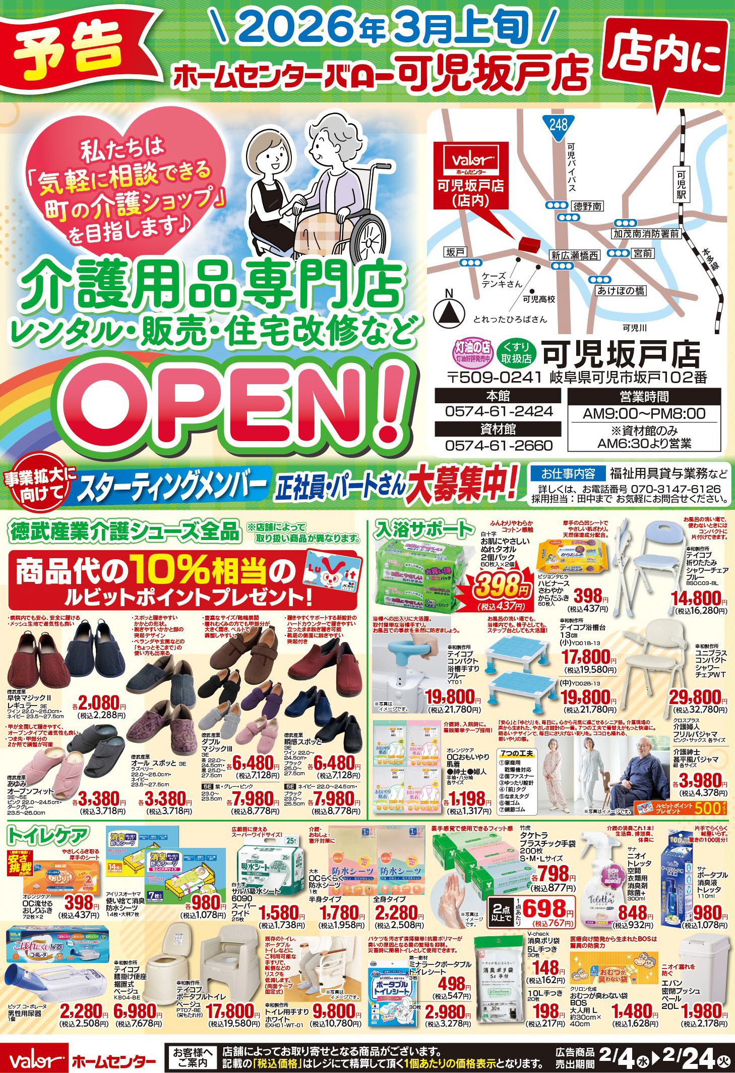 2月4日号 介護用品 特集 2026 2/03 19店舗可児坂戸店 限定 【取り扱い店舗】 大垣南店・江南店・関緑ヶ丘店・高山店・池田店・国府店・岩村店・稲沢平和店・領下店・養老店・正木店・ミタス伊勢店・羽島インター店・各務原中央店・久居インター店・中津川苗木店・荻原店・小牧岩崎店・豊橋神野店 2026年2月4日(水)〜2月24日(火)までセール実施中!お近くの店舗のチラシをチェック!