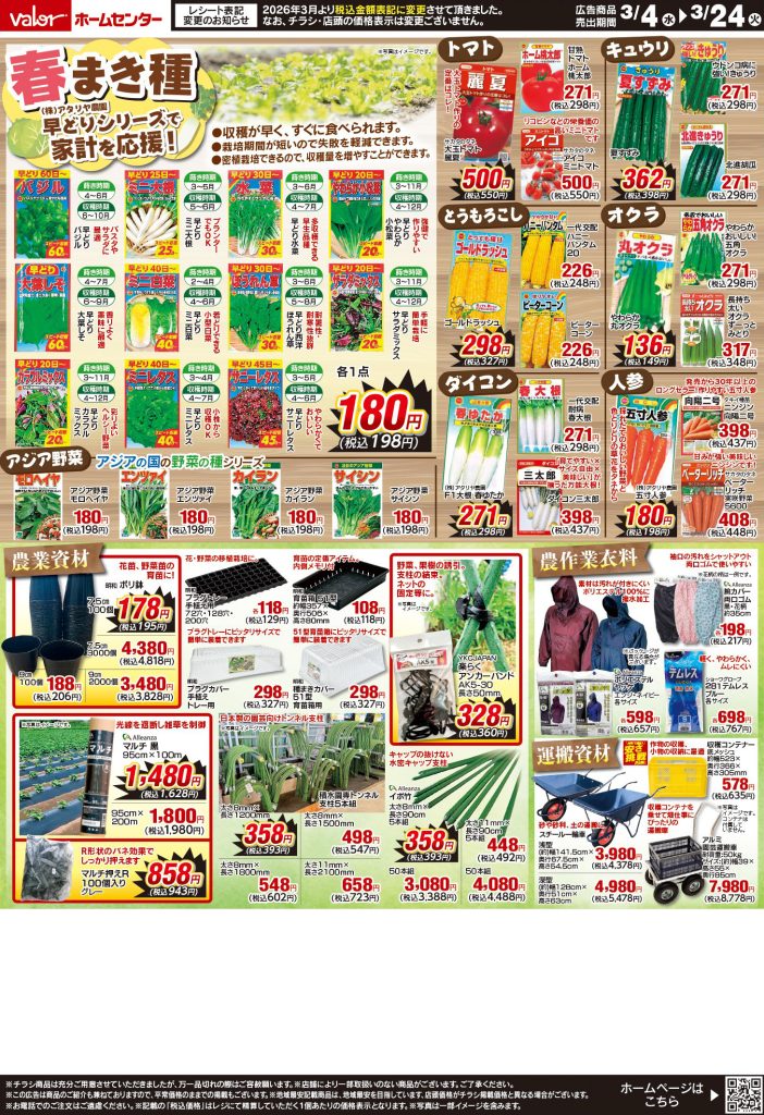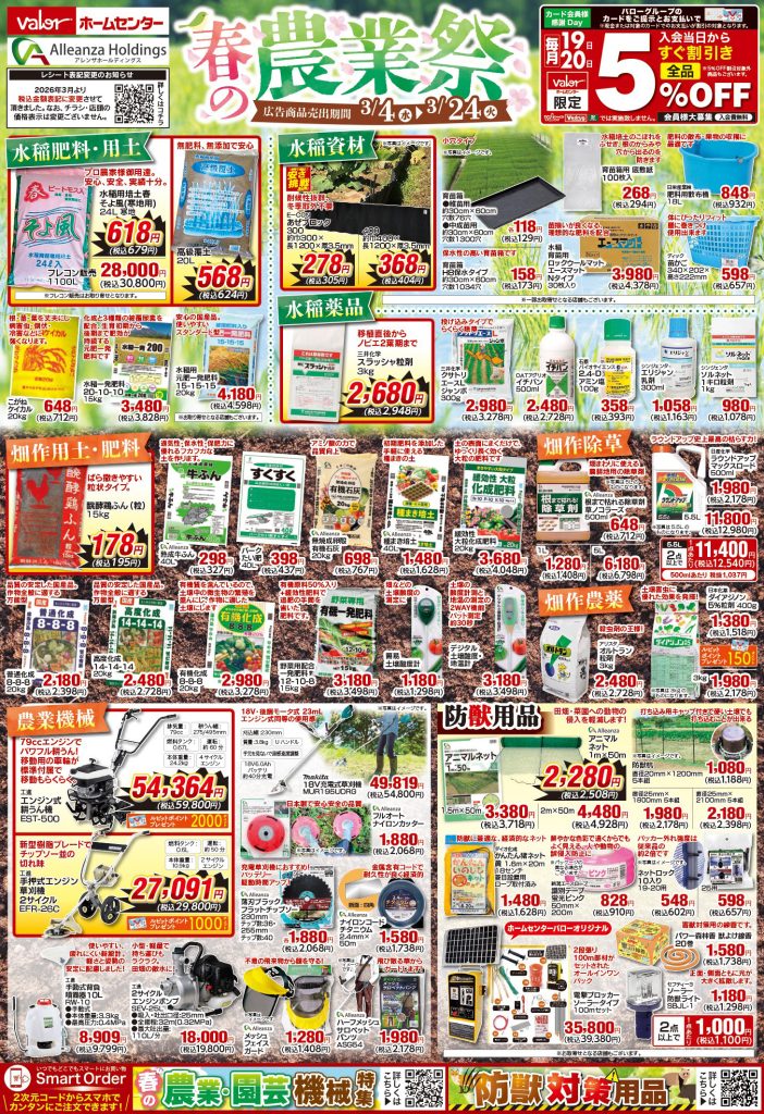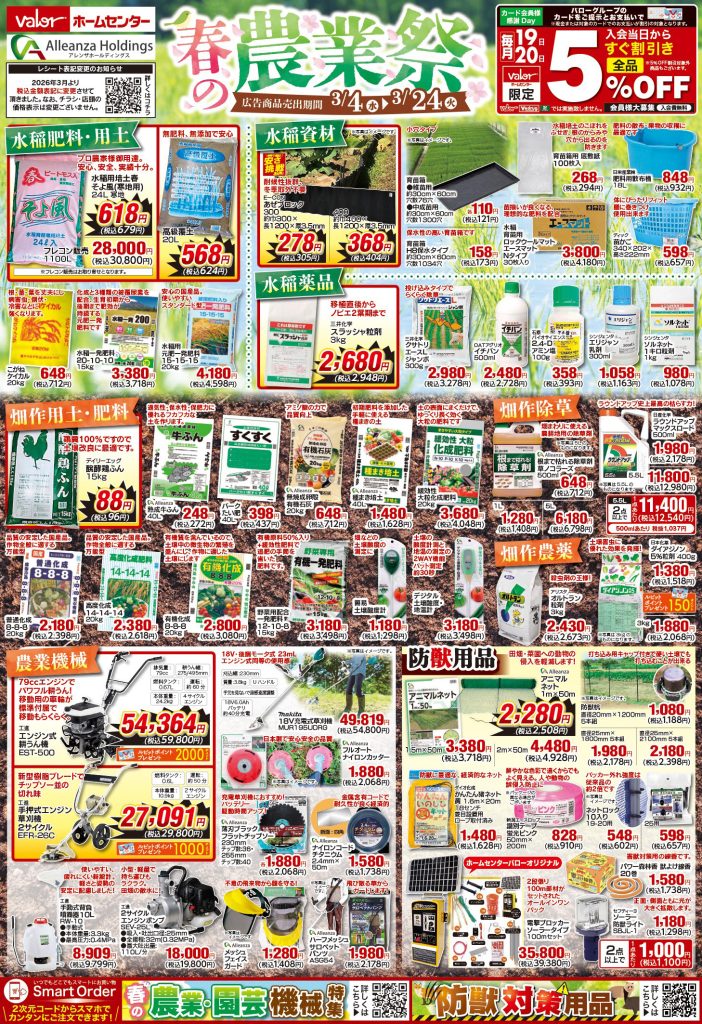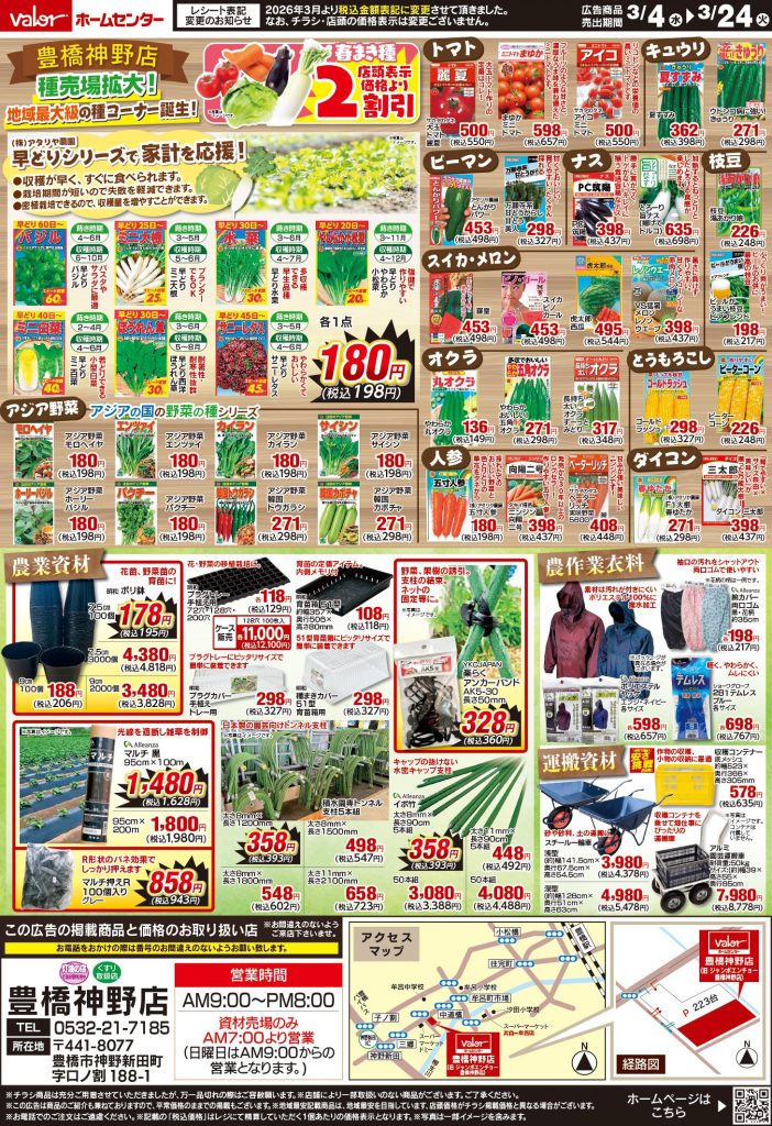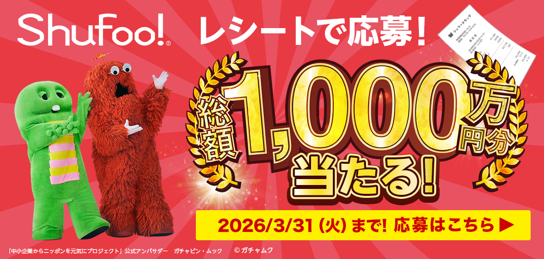 3月4日号 春の農業祭 2026 3/03 全店(領下店・桃花台店・稲沢平和店・羽島インター店・鈴鹿店・守山店・高蔵寺店・瀬戸店は対象外です)豊橋神野店 限定 2026年3月4日(水)〜3月24日(火)までセール実施中!お近くの店舗のチラシをチェック! 2026年3月31日(火)までShufoo!レシートキャンペーン開催中!今すぐ詳細をチェック!