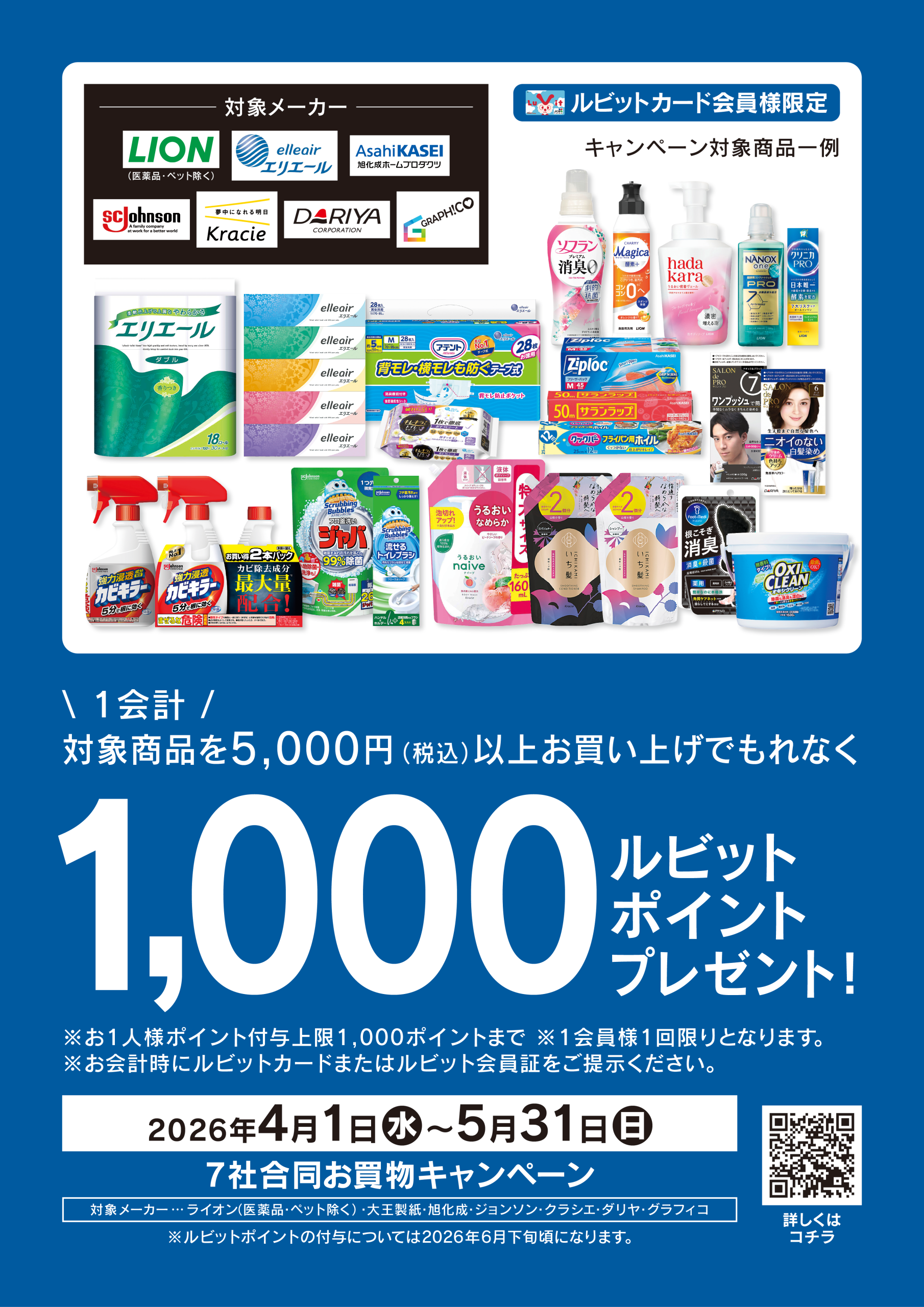 2026年4月1日(水)~5月31日(日)の期間中に対象商品を1会計合計5,000円(税込)以上お買い上げいただくと
