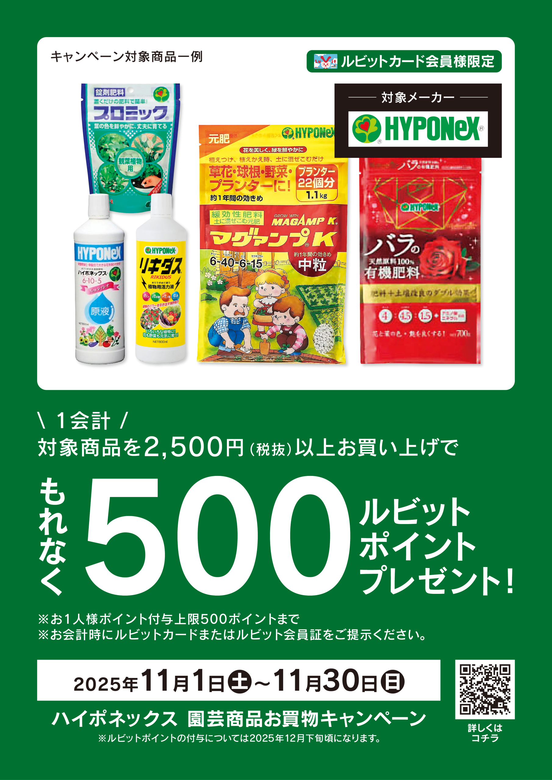 【ルビットカード会員様限定】ハイポネックス 園芸商品お買物キャンペーン!