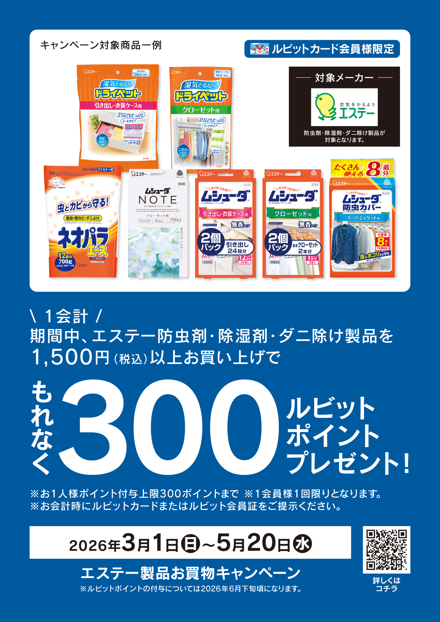 2026年3月1日(日)~5月20日(水)の期間中に対象商品を1会計1,500円(税込)以上お買い上げいただくと