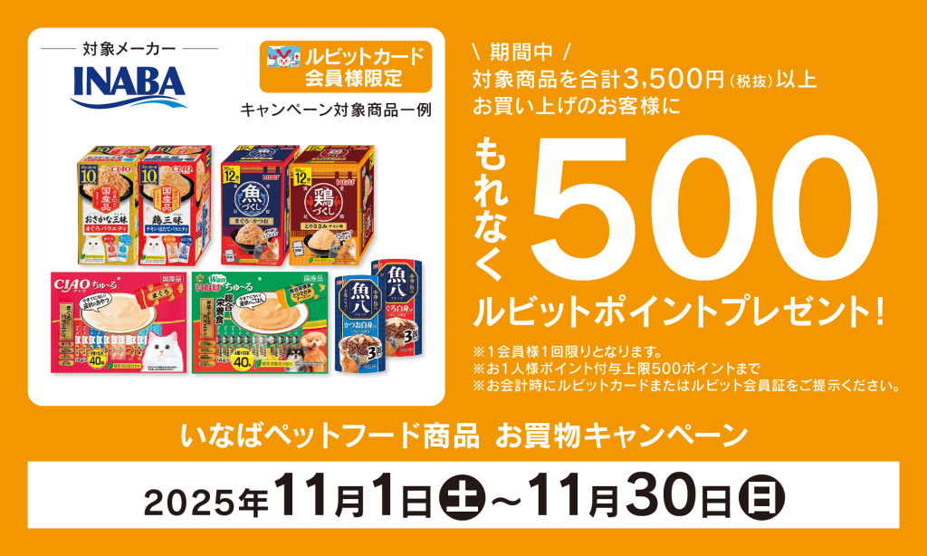 ◆ ルビットカード会員様限定 ◆ 2025年11月1日(土)~11月30日(日)の期間中にいなばペットフードの対象商品を合計3,500円(税抜)以上お買い上げいただくと もれなく500ルビ... -