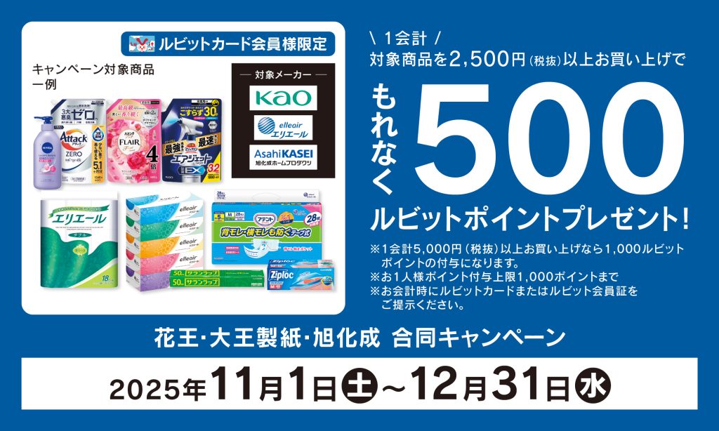 ◆ ルビットカード会員様限定 ◆ 2025年11月1日(土)~11月30日(日)の期間中に対象商品を1会計合計2,500円(税抜)以上お買い上げいただくと もれなく500ルビットポイントプ... -