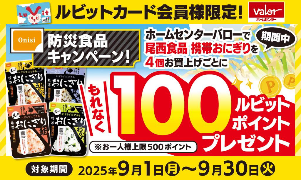 ◆ ルビットカード会員様限定 ◆ 9月1日(月)~9月30日(火)の期間中にホームセンターバローで尾西食品 携帯おにぎりを4コお買上げごとに もれなく100ルビットポイントプレ... -